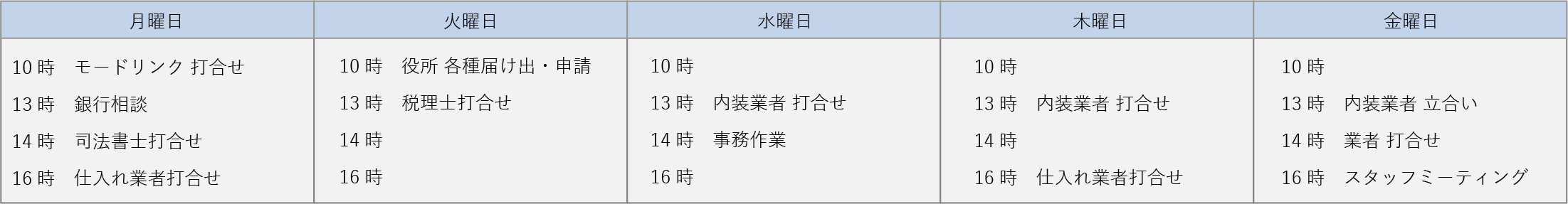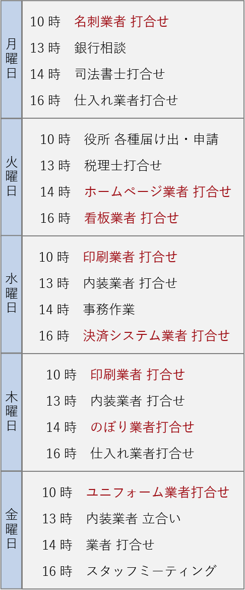 業者との打ち合わせ、仕入れ等の選定、店舗内装確認、備品購入、各種書類作成、各種申請・届け出など