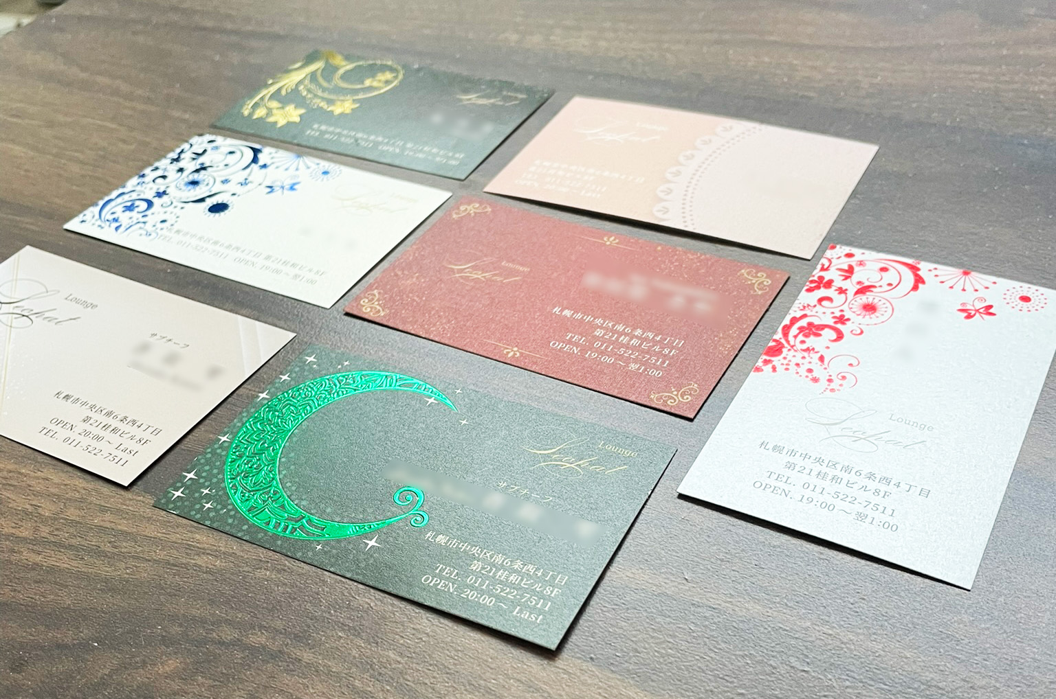 名刺 Lounge Leopat 様 デザイン 名刺・カード コメント 飲食店の名刺制作をご紹介させていただきます。 札幌すすきののラウンジレオパト様の名刺デザイン・印刷を制作させていただきました。 名刺デザインは30種の名刺デザインを制作し、その中からスタッフが自由に好みのデザイン・用紙・箔押しを選択するという形態をとっています。 用紙は厚さ・質感などが違う12種、箔押しは金・銀をはじめ赤など7色から選択する形態です。 一般的な名刺の名前だけを変更する画一的なものではなく、スタッフそれぞれがオリジナリティのある名刺を制作することができ、お客様へも印象も深く感じることができます。 モードリンクでは、クライアント様それぞれのご要望に合わせたご提案・制作を行っています。 ぜひお気軽にご相談ください。 前の記事: ポポヤクロゴ 制作事例一覧に戻る